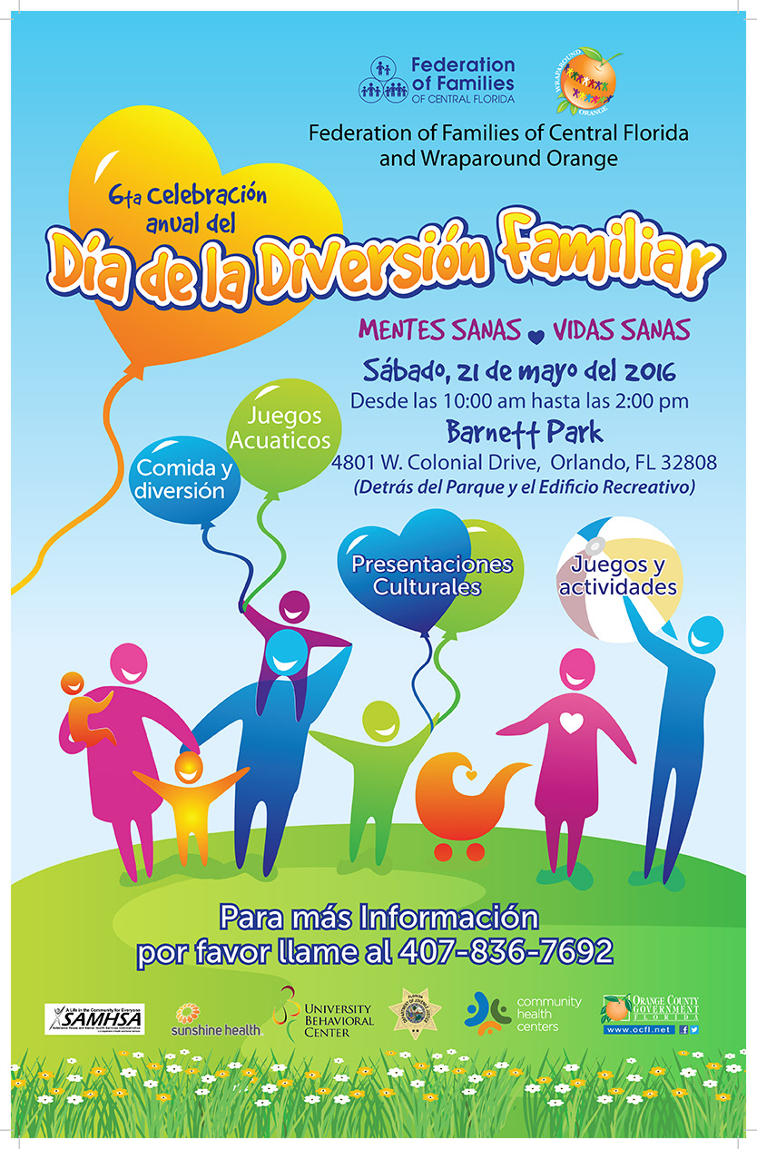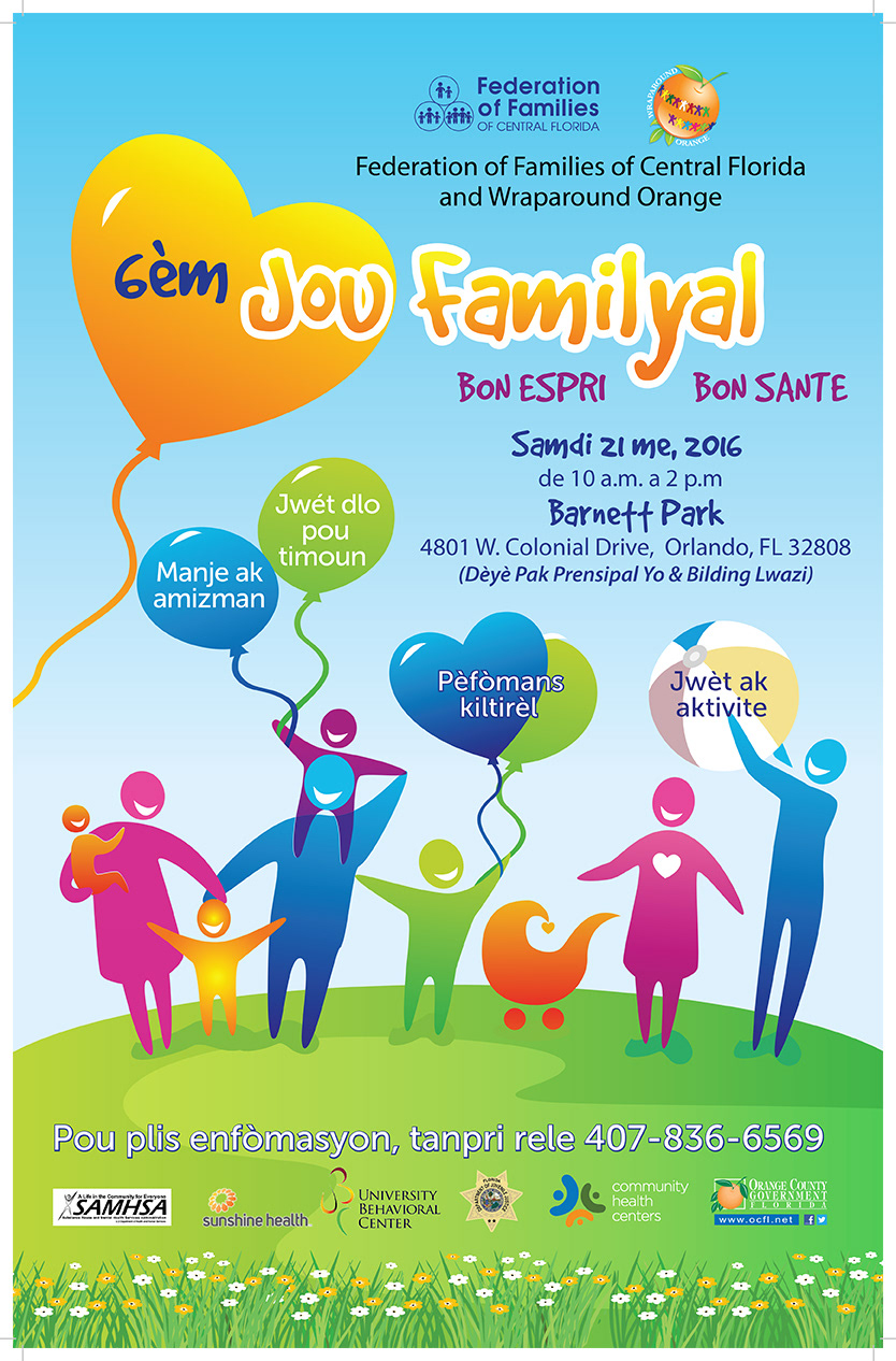 Posters in English, Spanish and Creole promoting Family Fun Day in Orange County.